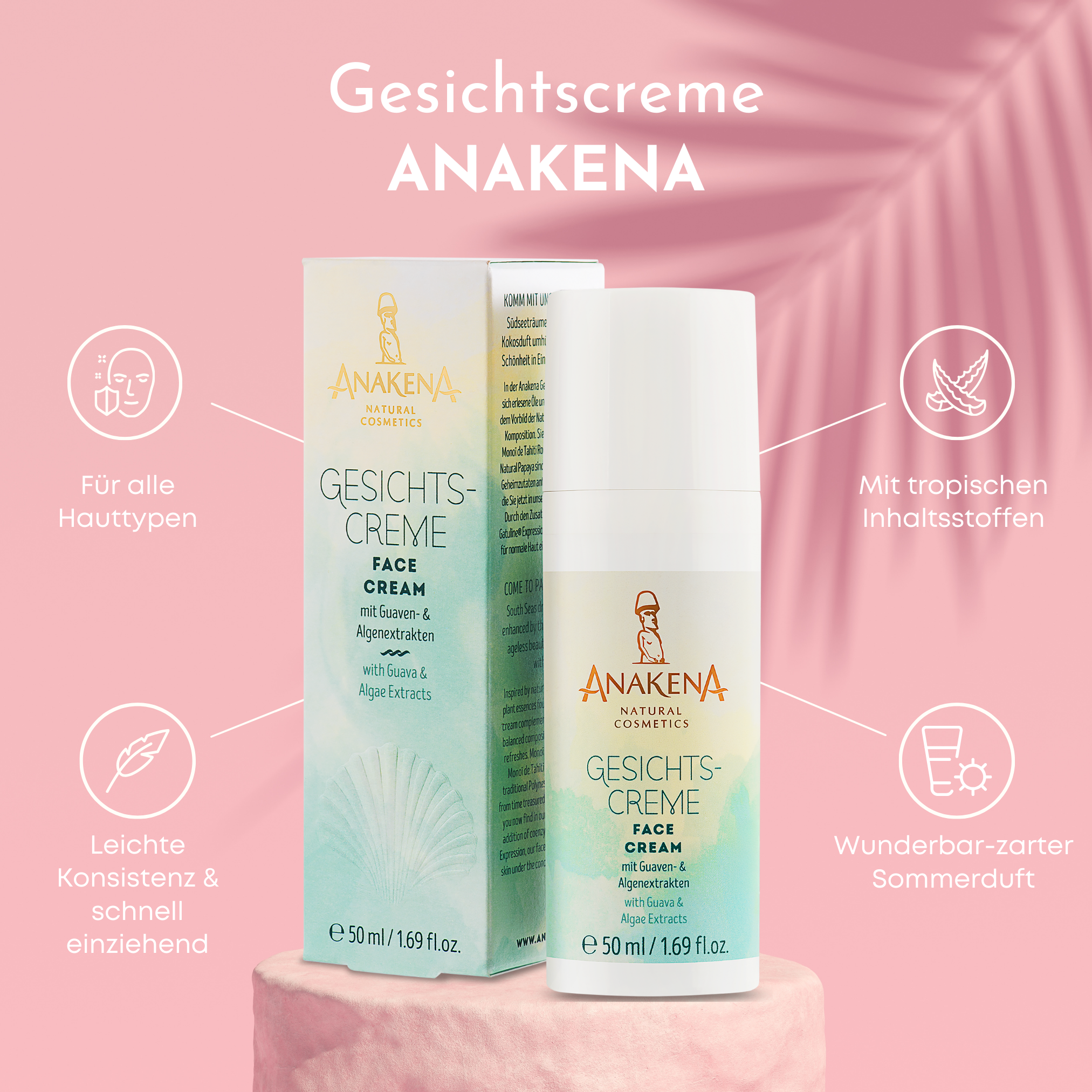 Die Anakena Gesichtscreme vereint das Beste aus zwei Welten: exotische Schönheitsrituale aus Polynesien und moderne, pflanzenbasierte Wirkstoffkosmetik aus Deutschland. In dieser einzigartigen Formulierung stecken 27 sorgsam ausgewählte Inhaltsstoffe, die Ihre Haut intensiv pflegen, schützen und ihre natürliche Ausstrahlung fördern.